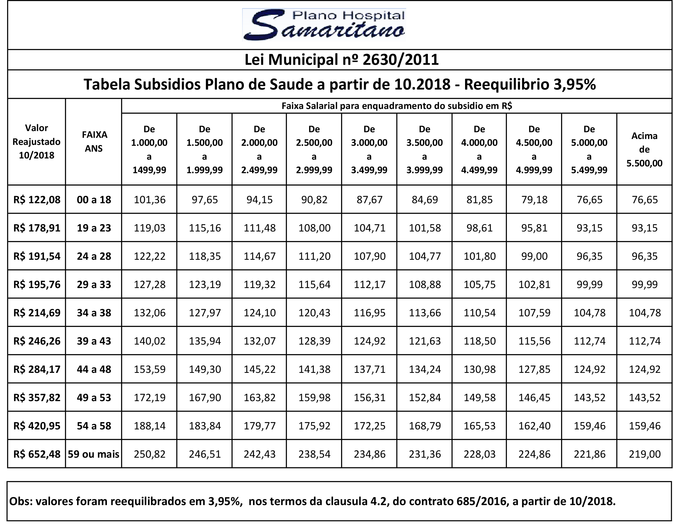 Por meio do convênio com o hospital, a Prefeitura subsidia parte do valor do plano de saúde. O valor do subsídio varia conforme a idade e a faixa salarial do servidor. O subsídio é descontado na folha de pagamento. A Administração concederá o subsídio somente aos servidores. Os dependentes dos servidores poderão ter acesso ao plano, mas sem o subsídio da Administração. Caso o servidor deseje, ele pode fazer o plano de saúde para os dependentes também sem carência.