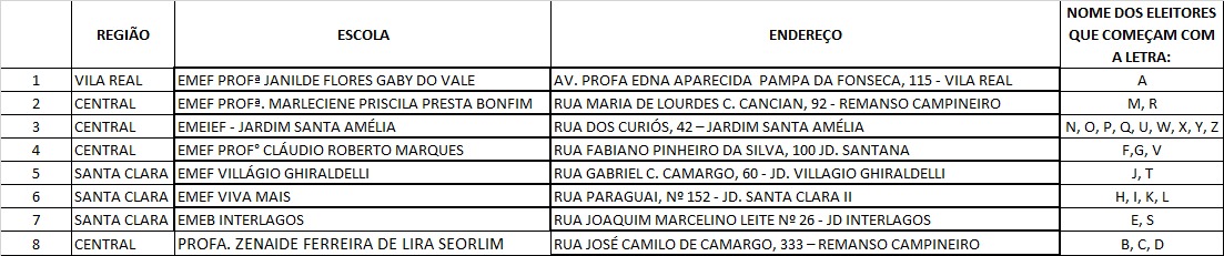 Haverá oito locais de votação (veja no arquivo anexo), em diversos bairros. Em razão da pandemia do Coronavírus, foram definidos dois horários de votação: das 8h às 9h, para maiores de 60 anos e gestantes, e das 9h às 15h, para o público em geral.