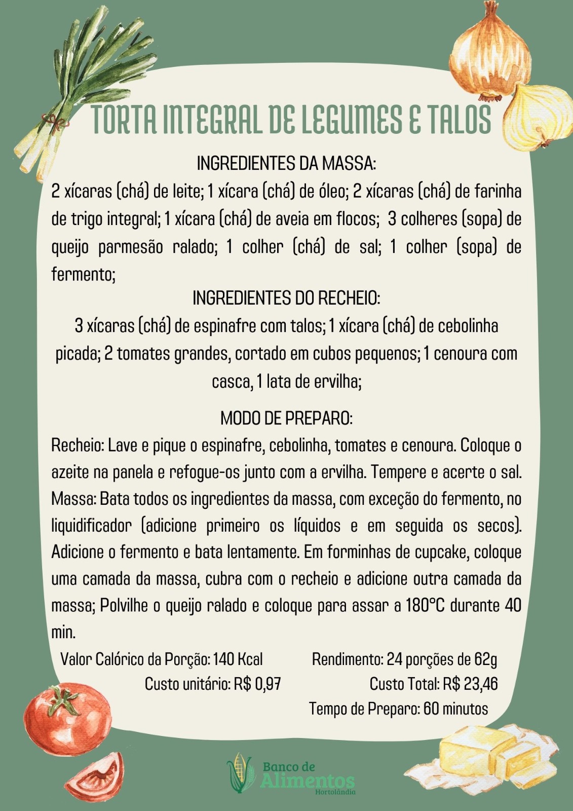 A formação foi ministrada pela nutricionista do Departamento de Segurança Alimentar, Bruna Valdevino Barbosa. Durante a aula, os aprendizes puderam acompanhar, passo a passo, a preparação de duas receitas saborosas e nutritivas: a “Torta integral de Legumes e Verduras com Talo” e o “Suco de abacaxi com casca e hortelã”. Além de colocarem a mão na massa, em todas as etapas de preparação, os participantes também aprenderam sobre as propriedades nutricionais de cada ingrediente, a importância do aproveitamento integral dos alimentos, como evitar desperdícios na cozinha e boas práticas de higiene e manipulação dos alimentos. Ao final da atividade, também tiveram a oportunidade de degustar as duas receitas.