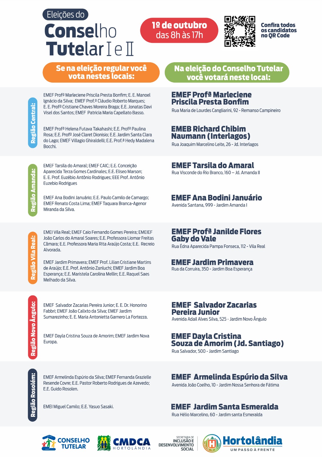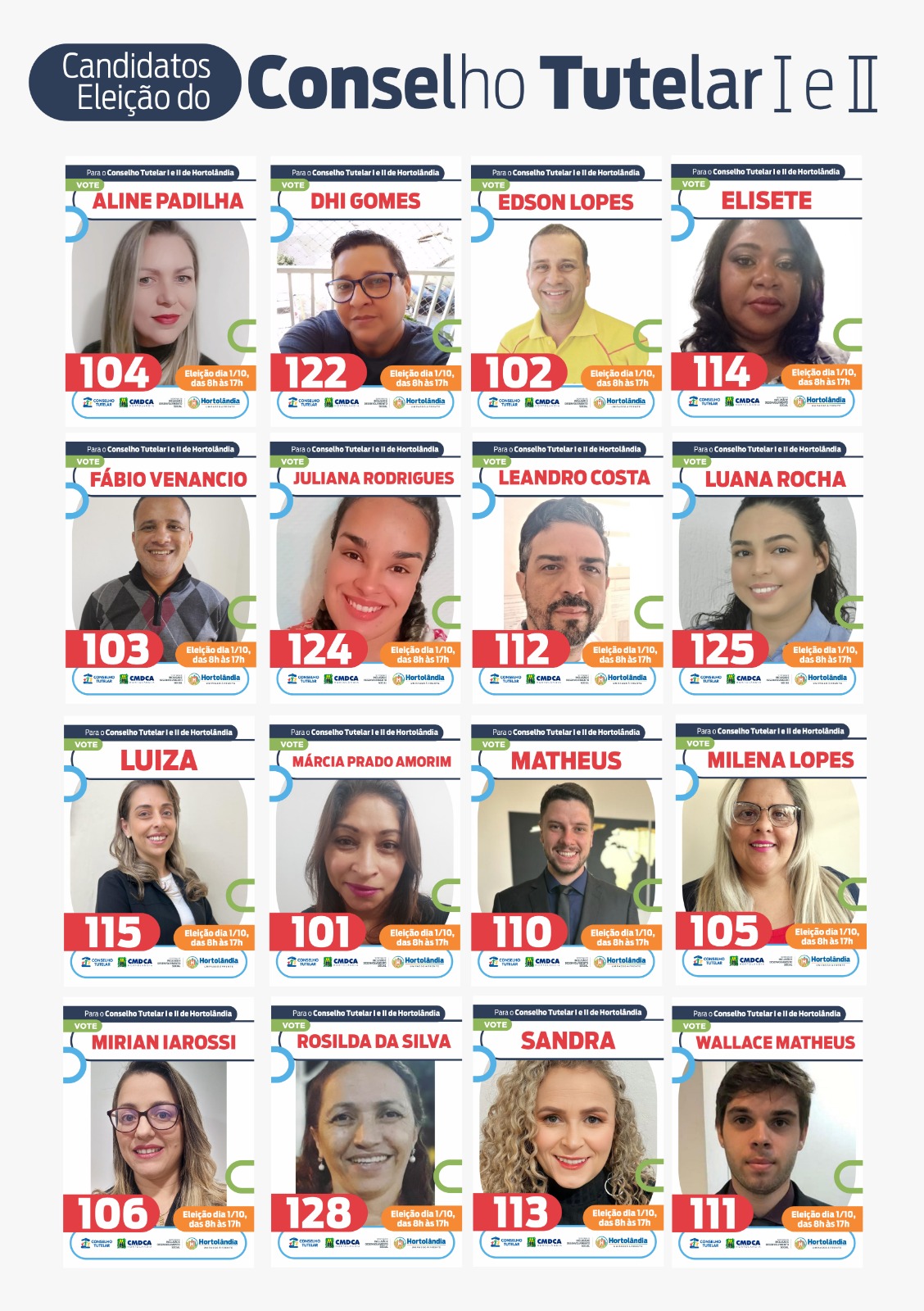 O CMDCA (Conselho Municipal dos Direitos da Criança e Adolescente), órgão vinculado à Prefeitura de Hortolândia por meio da Secretaria de Inclusão e Desenvolvimento Social, se prepara para a realização da eleição dos novos membros do Conselho Tutelar I e II. O pleito será realizado no dia 01 de outubro, das 8h às 17h, em dez EMEFs (Escolas Municipais do Ensino Fundamental) espalhadas pelas cinco regiões da cidade (consulte os locais de votação e os candidatos em anexo abaixo). O pleito elegerá 10 membros conselheiros tutelares e 10 suplentes, para um mandato de 4 anos, válido de janeiro de 2014 a fevereiro de 2027.