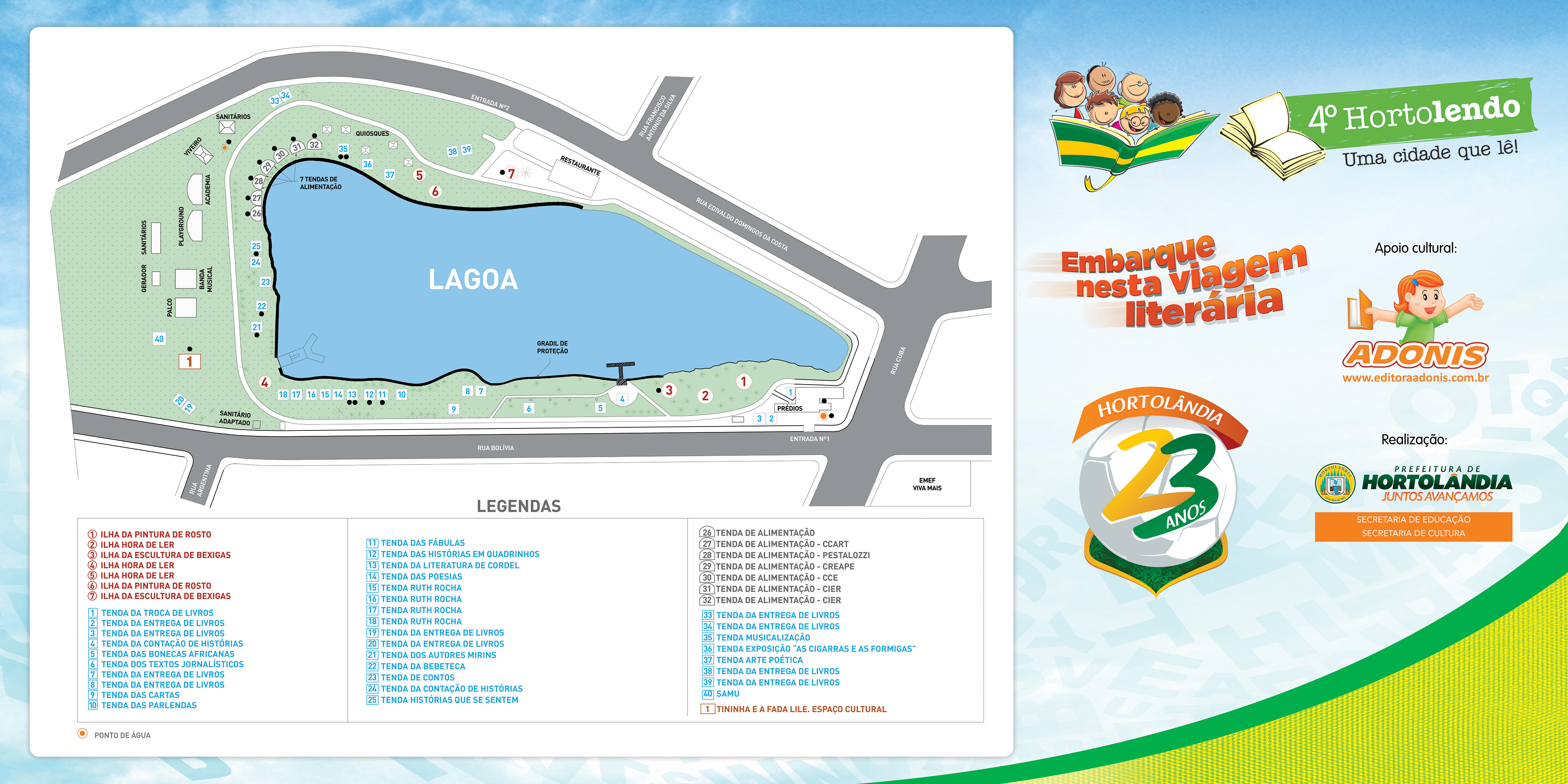 No Parque escola, foram montadas 33 tendas, cinco para pontos de entrega de livros, quatro para espaços de pintura de rosto e bexiga, três ilhas de leitura ao ar livre, um palco para programação cultural e outro para apresentações do CEMMH (Centro de Educação Musical Municipal de Hortolândia), além das sete que formam a praça de alimentação.