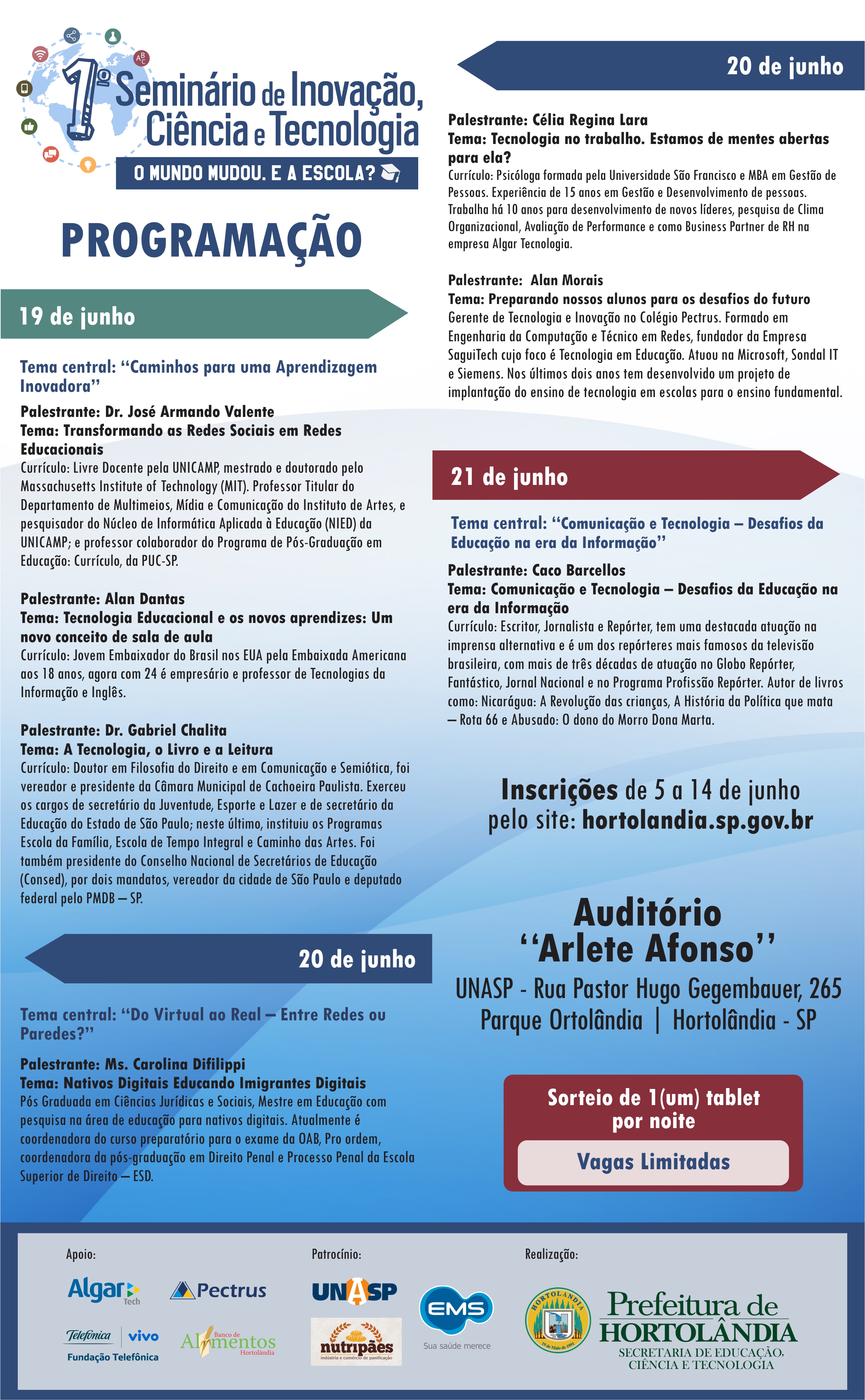 A Prefeitura de Hortolândia abre, nesta segunda-feira (05/06), as inscrições para o 1° Seminário de Inovação, Ciência e Tecnologia, que a Secretaria de Educação, Ciência e Tecnologia promove entre os dias 19 e 21 deste mês. Elas devem ser feitas exclusivamente pelo site da Prefeitura (www.hortolandia.sp.gov.br), clicando no banner do evento. Há 450 vagas disponíveis, que serão preenchidas por ordem de inscrição. É possível se inscrever em todas as palestras ou em cada uma delas, individualmente. A programação completa também estará disponível no site da Prefeitura.