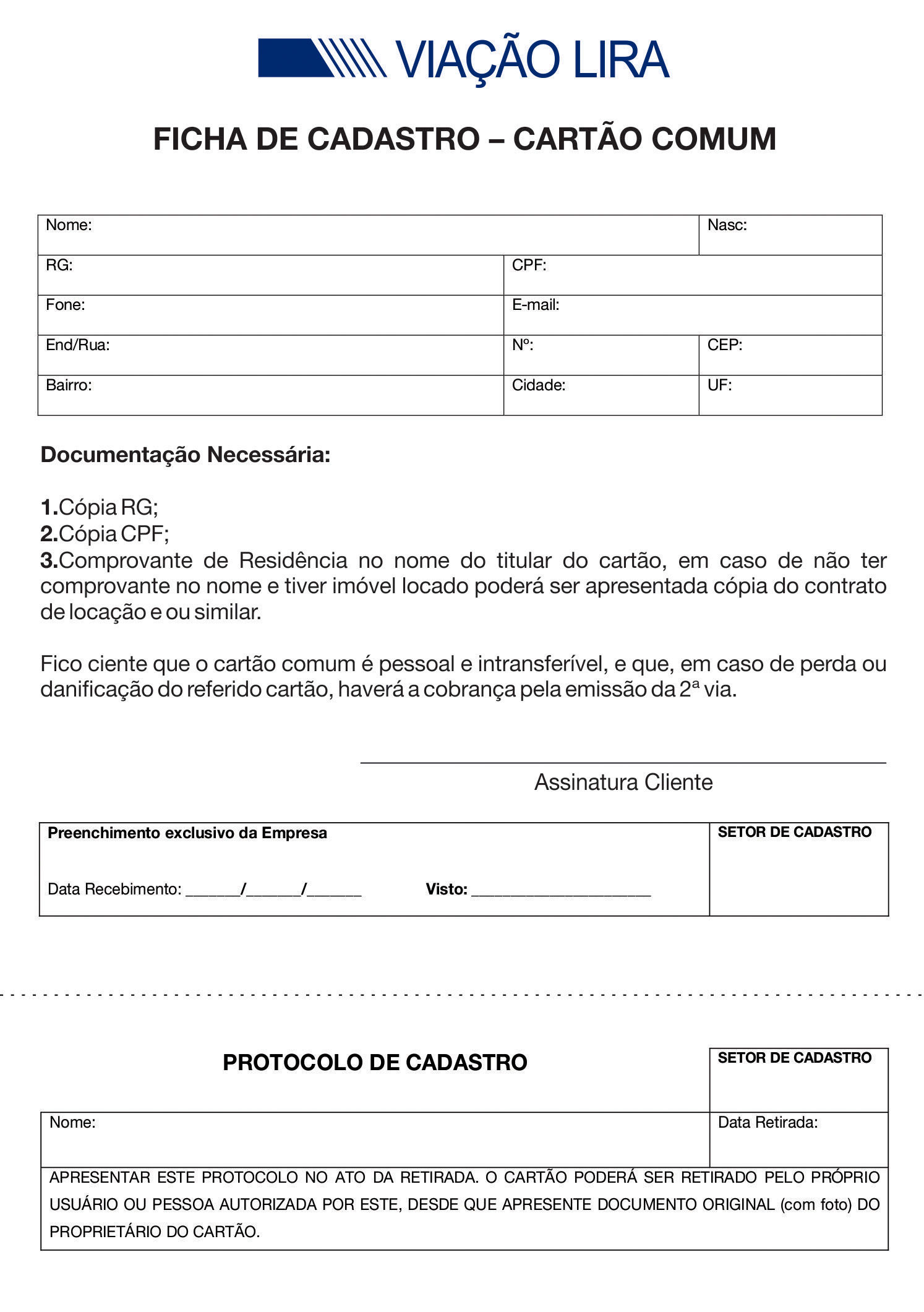 - Preencher o formulário anexo e entregar em um dos pontos de cadastramento com cópia dos seguintes documentos: RG, CPF, comprovante de residênciaem nome do titular do cartão.